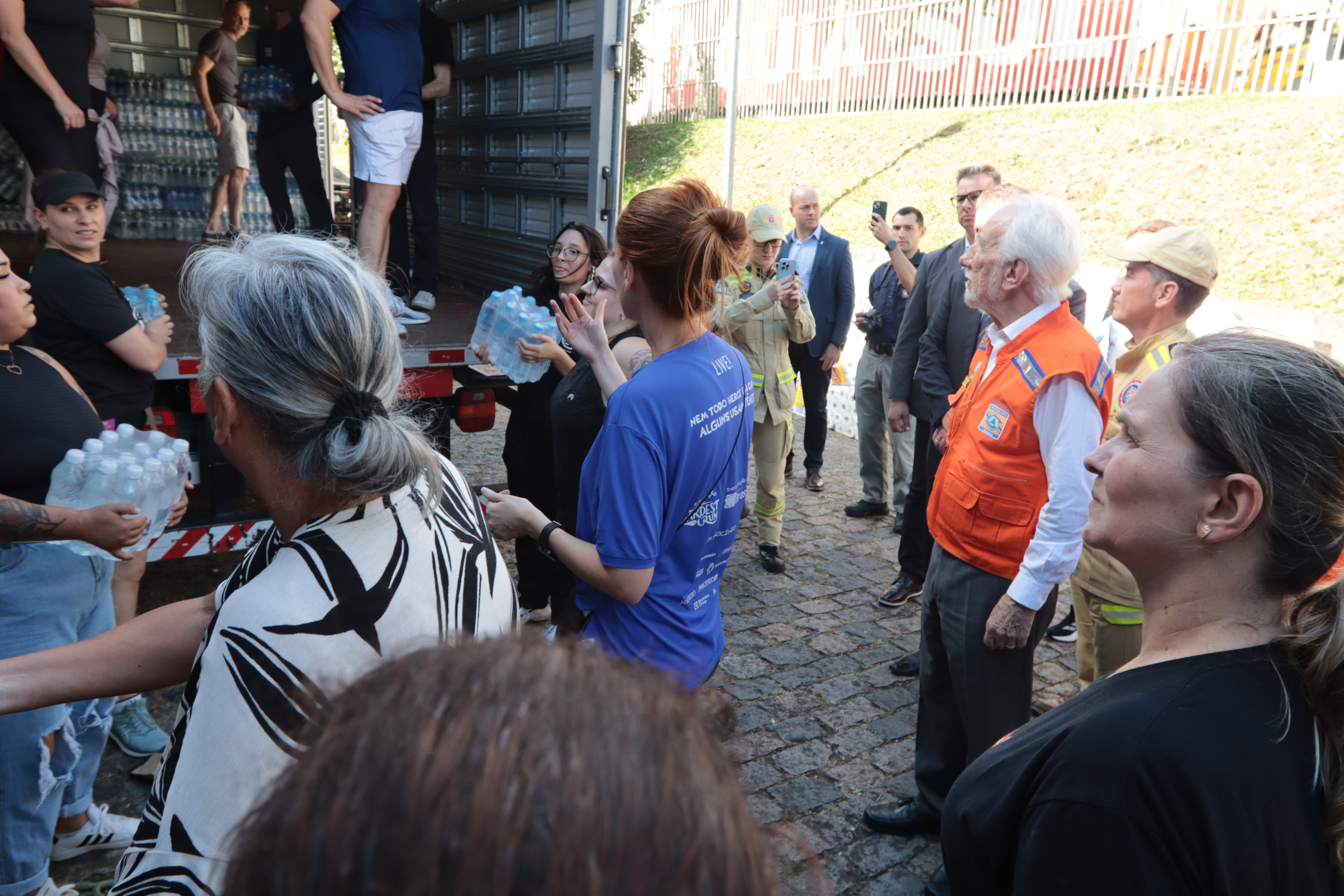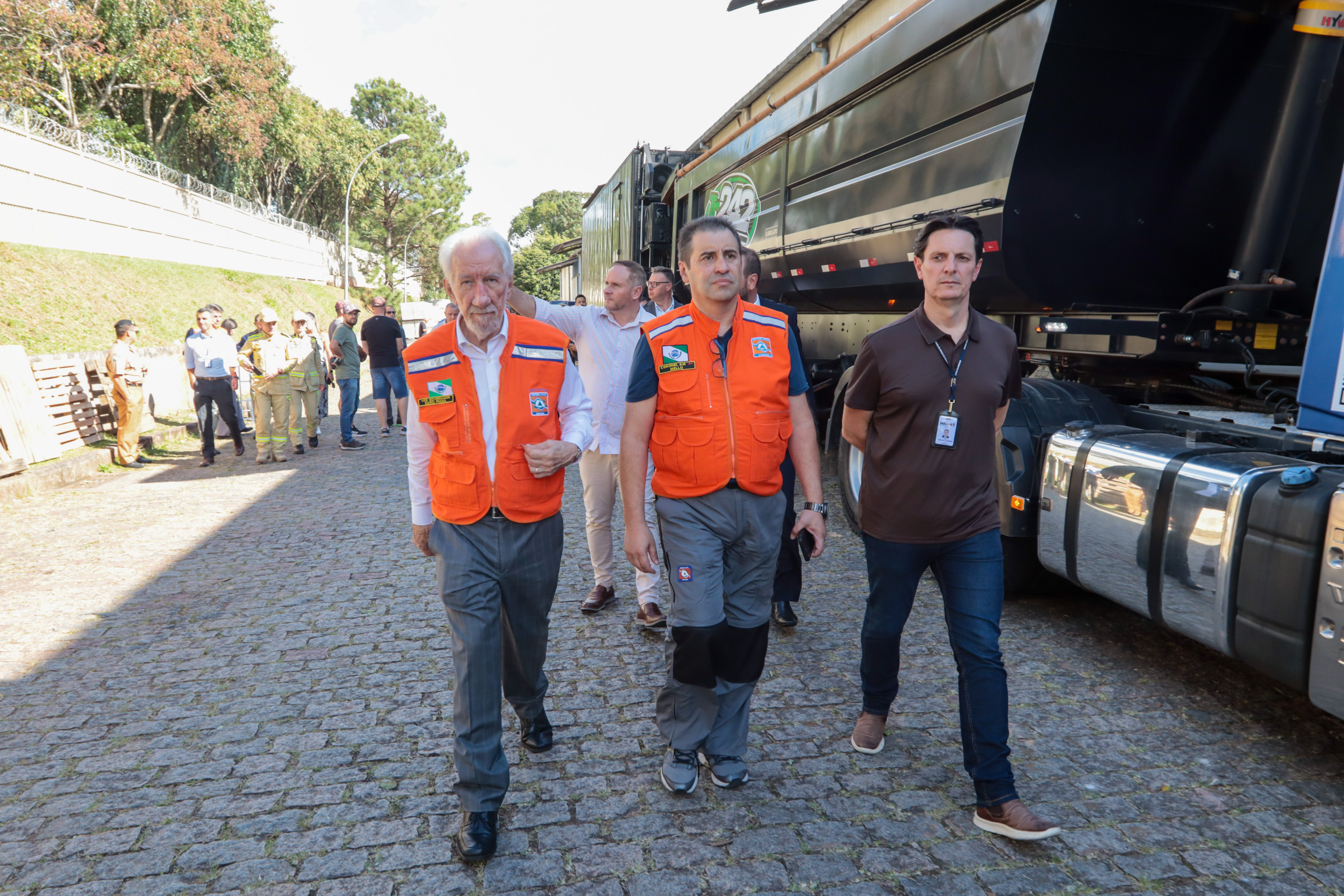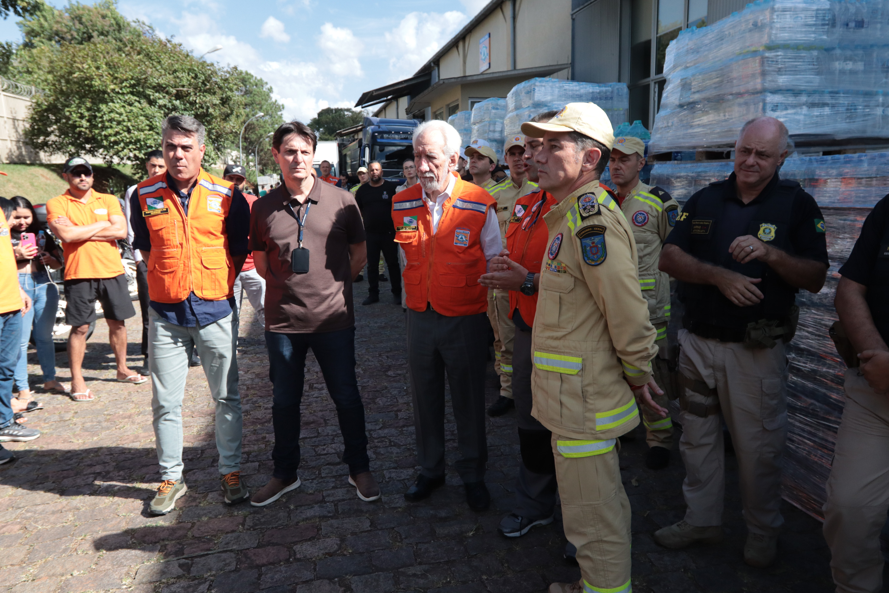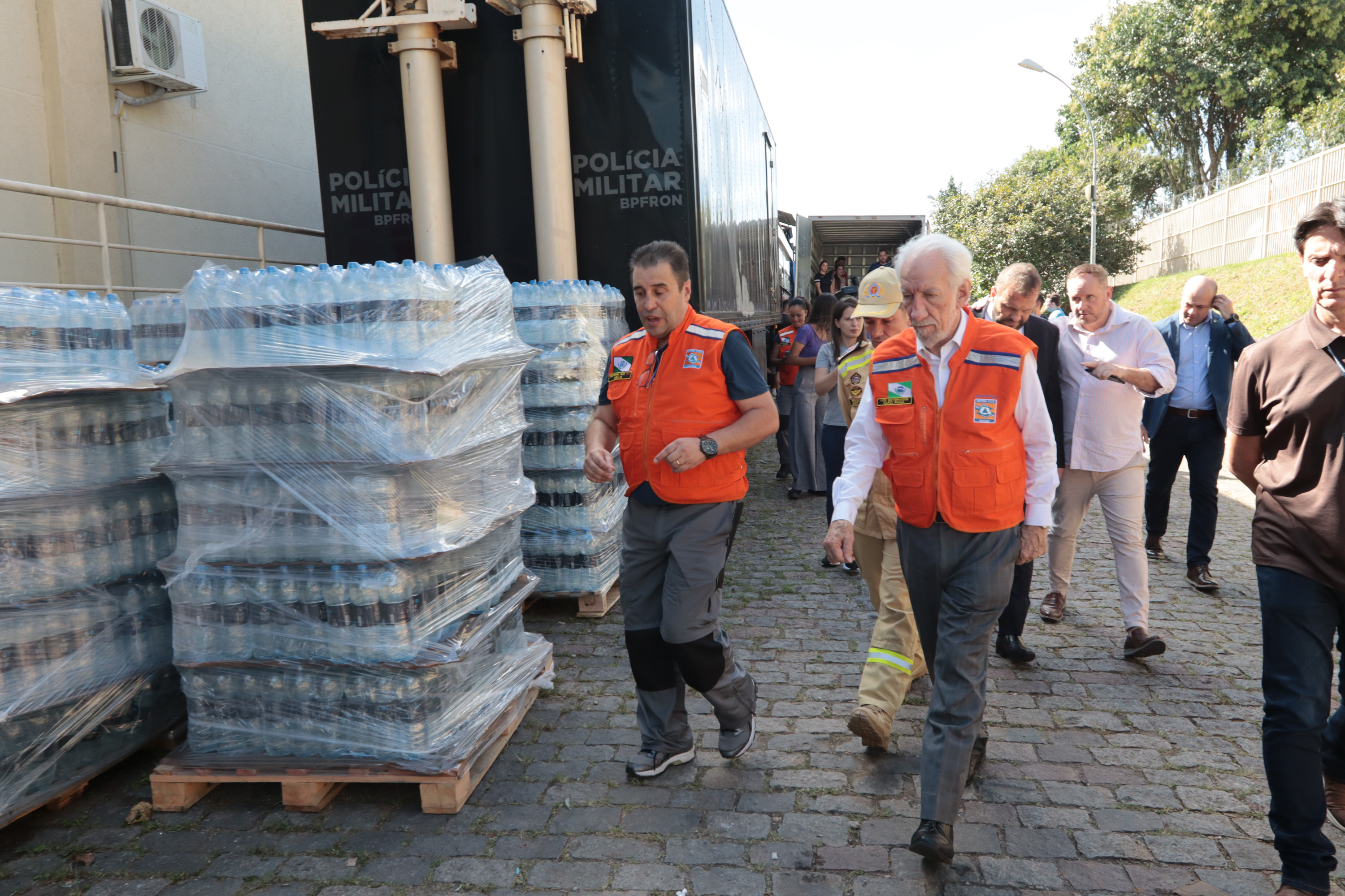 Governador em exercício Darci Piana acompanha a saída dos caminhões que levam as doações para o Rio Grande do Sul.