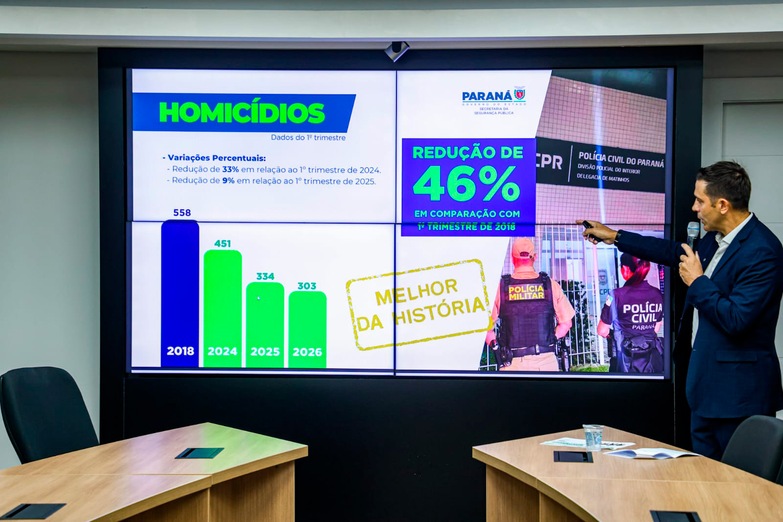 O número de homicídios caiu 10% no primeiro trimestre de 2026, no comparativo com o mesmo período de 2025, segundo dados do Centro de Análise, Pesquisa e Estatística (Cape) da Secretaria da Segurança Pública do Paraná (Sesp). Foram 303 homicídios registrados em 2026 contra 334 no primeiro trimestre de 2025, que já foi o ano com os menores números da série histórica. Em 2024 haviam sido 451 homicídios nos três primeiros meses do ano somados, o que significa uma queda de quase 33% para 2026.