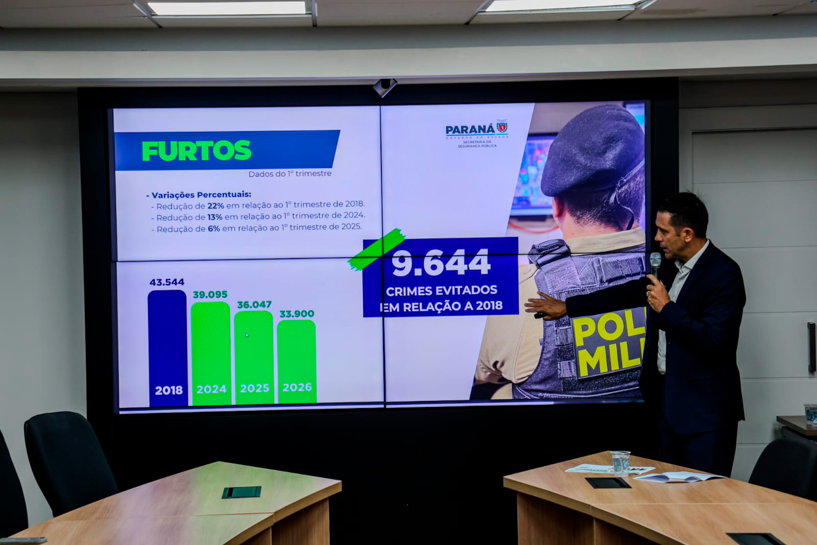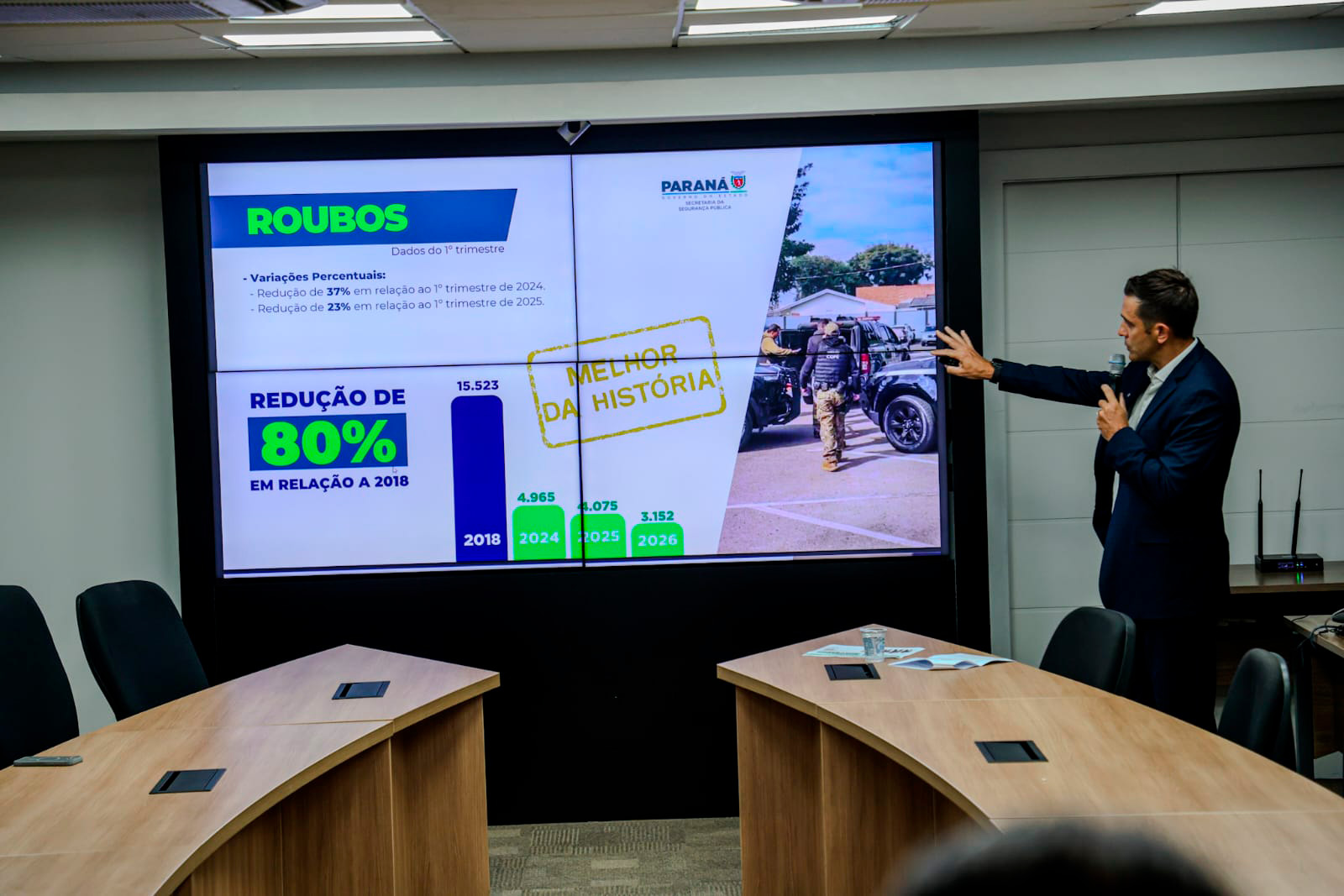 ROUBOS – Os crimes patrimoniais também caíram. Os roubos, onde há uso de força ou ameaça, tiveram nova queda no Paraná, com uma redução no primeiro trimestre deste ano de quase 23% (de 4.075 para 3.148) em relação ao mesmo período de 2025 e de quase 37% na comparação com 2024.
