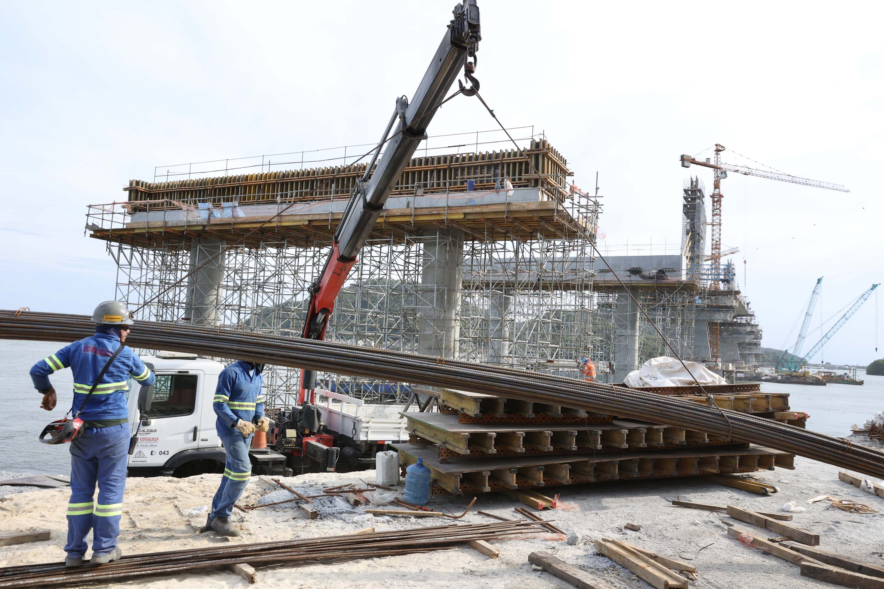 TRECHO ESTAIADO – O trecho estaiado da ponte, responsável por vencer o vão-livre de 160 metros sobre o canal de navegação da Baía de Guaratuba, avança com o método de balanços sucessivos. No apoio 4 já foram executados sete pares de aduelas, somando 92 metros, e no apoio 5, seis pares, totalizando 81 metros. O avanço acumulado nesse trecho chega a 173 metros dos 320 metros previstos. Também foram instalados cinco pares estais no apoio 4 e quatro pares no apoio 5.