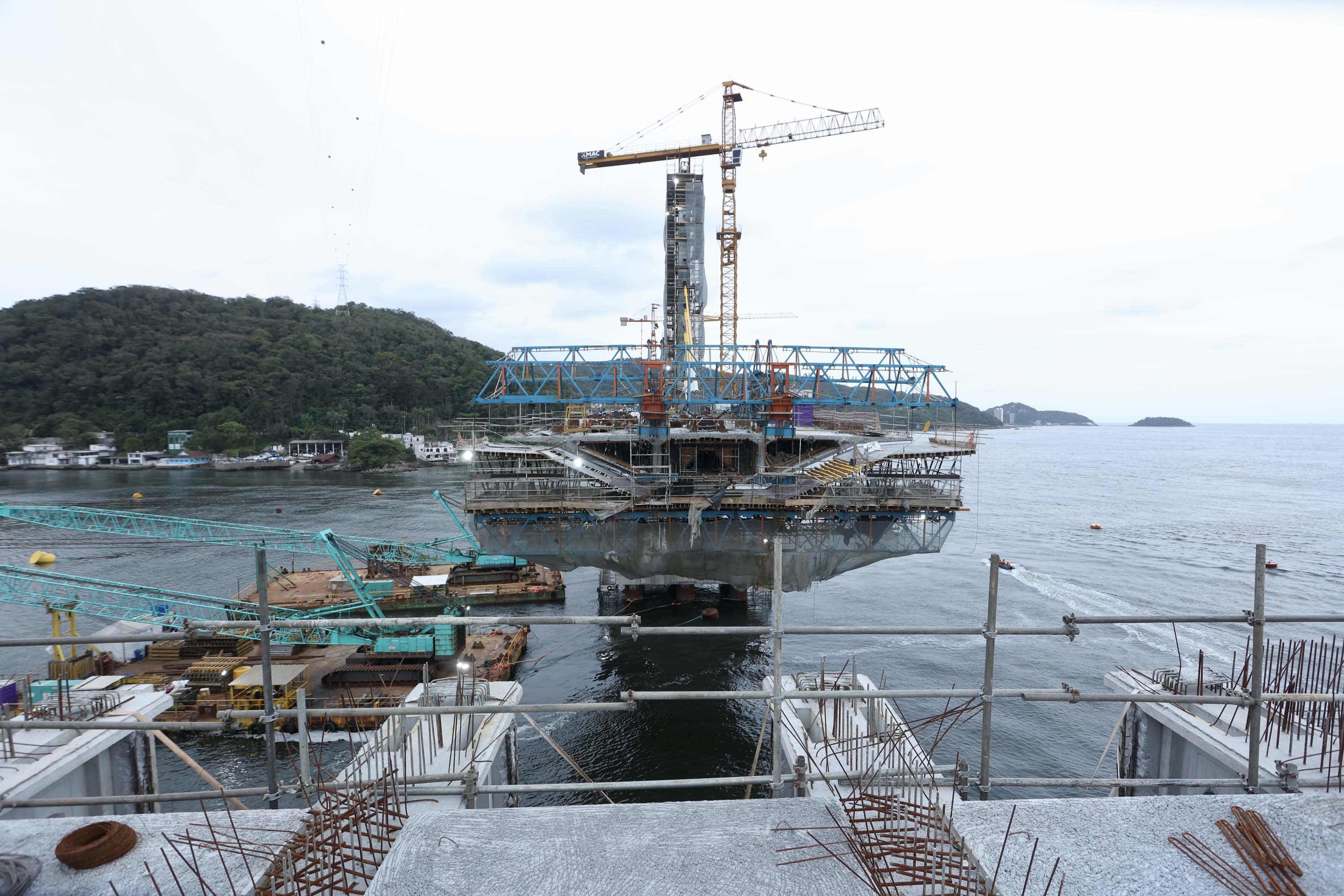 A Ponte de Guaratuba, a maior obra de infraestrutura em execução no Paraná, continua em ritmo acelerado e alcançou importantes marcos ao longo do mês de outubro, chegando a 80% de execução. O empreendimento já soma 173 metros de avanço no trecho estaiado, o mais emblemático da obra, e 596,9 metros finalizados no trecho pré-moldado.