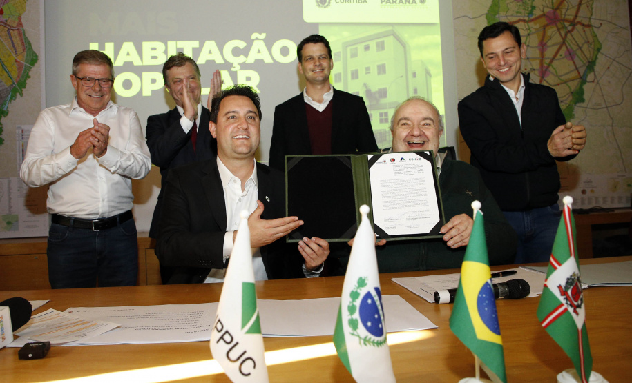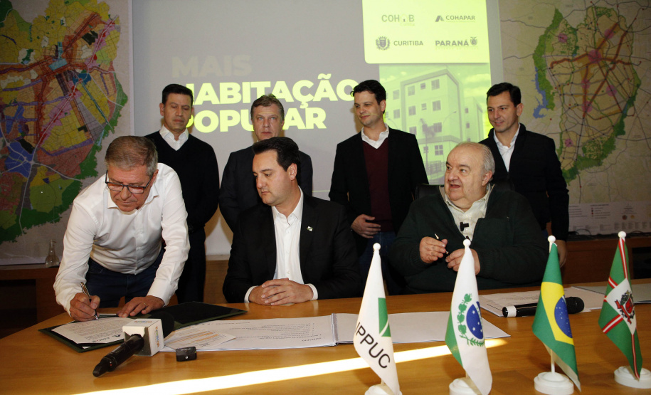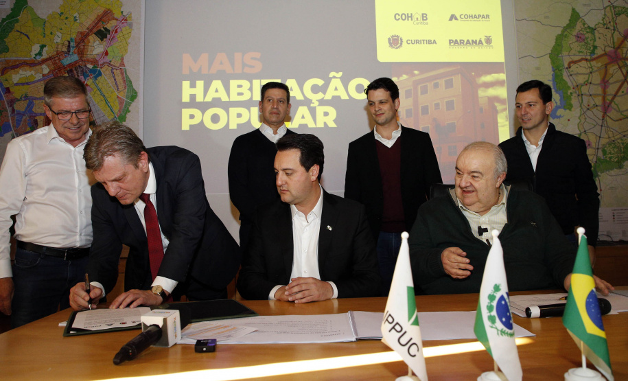 HABITAÇÃO – O protocolo de intenções assinado nesta quarta-feira formaliza a parceria entre Cohapar e Cohab no âmbito do programa Casa Fácil Paraná. A partir de agora, os executivos estadual e municipal trabalharão de forma integrada para ampliar benefícios da iniciativa na capital paranaense, o que deverá facilitar a aquisição de novas moradias pelos curitibanos.